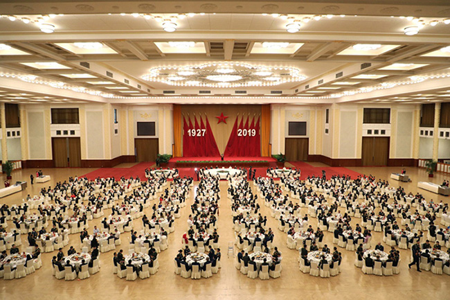 人民大會堂燈火輝煌,中外嘉賓歡聚一堂。主席台帷幕中央懸掛著巨型“八一”軍徽,兩旁是十麵鮮豔的紅旗。“1927-2019”醒目的大字熠熠生輝,昭示著中國人民解放軍走過92年不平凡歲月。