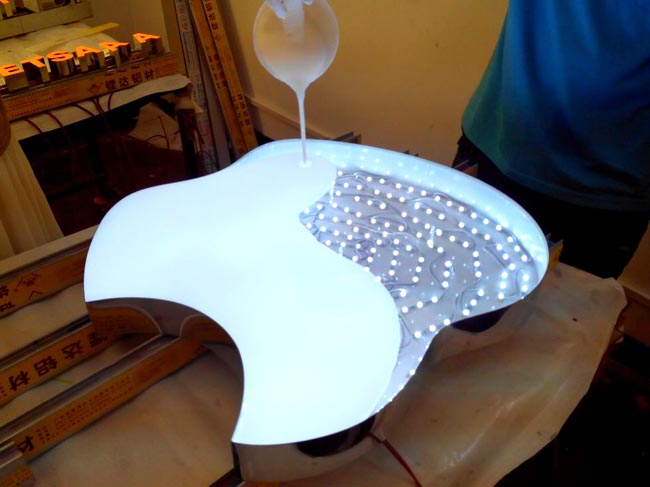 LED樹脂發光字是由外殼、填充原料、發光源三部分組成。是由調製好的樹脂倒入預先製好的模具裏固化成型的,僅這個模具上,得考驗產品的外觀是不是美觀和標準。並且模具成本方麵不能太高以及製作方便快速。固化後脫模修整裝燈了。